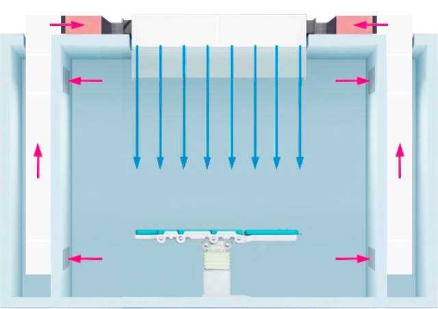 Такой ход применяют, если нужно добиться стерильности, но централизованная вентиляция не предусмотрена проектом или ремонтируется. Воздух забирается из рабочей зоны, проходит очистку и вновь подается через потолок. Скорость течения воздуха регулируется автоматически. Основные параметры для регулировки — это объем воздушных масс и скорость выхода воздуха из потолка.